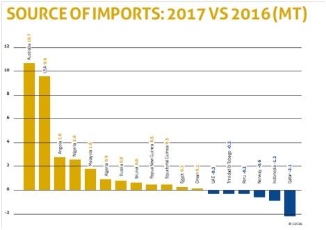 Malgré plusieurs démarrages retardés, de nouvelles capacités de liquéfaction du gaz naturel ont continué à venir en ligne dans divers régions du monde allant des États-Unis, à l’Australie, la Malaisie et à la Russie, conduisant à une augmentation de l'approvisionnement en GNL de 26,2 MTPA par rapport à 2016. Le surplus de GNL et des prix déprimés prévus pour 2017 ne se sont pas matérialisés, la hausse des importations en Chine a contribué de manière substantielle à équilibrer le marché».