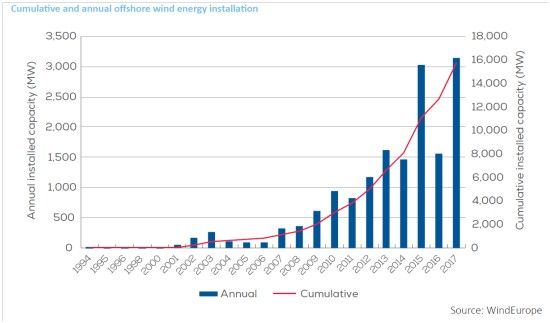 Les capacités des éoliennes en mer européennes ont augmenté de 25% en 2017. Treize nouvelles fermes d’éoliennes ont été achevées et la capacité totale s’est accrue de 3,1 gigawatts (GW), portant le total de l’éolien offshore à 15,8 GW. Le Royaume-Uni et l’Allemagne ont concentré la presque totalité des nouvelles turbines puisque les deux pays ont respectivement installé 1,7 GW et 1,3 GW.