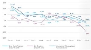 En 2019 la croissance de l’économie mondiale a continué de se tasser à 2.8 %, le taux le plus faible depuis 2009. Les tensions commerciales et les incertitudes politiques notamment liées au Brexit et aux élections américaines ont fait chuter la croissance du transport maritime à 1.7% en volume en 2019 à 11.08 milliards de tonnes transportées. Tous les types de transport ont été affectés, le transport de container ne croissant que de 2% contre 4.6% l’année précédente, le transport de pétrole diminuant de -2.5%.