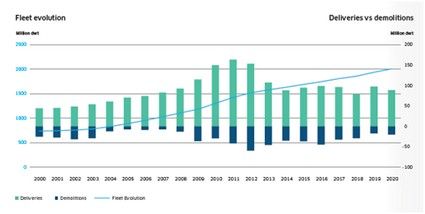 En 2018, la flotte mondiale totale s’élevait à 51 480 navires commerciaux de plus de 1000 tonnes brutes pour une capacité de de 1.92 milliards de tpl. En 2019, la flotte mondiale de navires de transport a augmenté de 2.6 % en volume, et de plus de 4% en 2020, du fait de livraisons toujours en excès des démolitions, à 2.05 milliards de tpl pour 52 961 navires (source UNCTAD statistics) - Infomarine.eu). Les transports de gaz ont connu une croissance rapide, suivie des pétroliers, vraquiers et porte-conteneurs. Les limitations affectant les chenaux d’accès, les ports, l’infrastructure et les chantiers navals, suggèrent que la taille des porte-conteneurs a probablement atteint en 2020 un sommet, autour de 24000 EVP. Ci-après l'évolution de la flotte (source BRS)