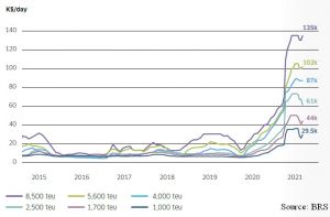 Durant l’année 2021, les taux de fret de vrac sec ont triplé, tandis que les prix du transport pétrolier atteignaient leurs plus bas niveaux historiques. Fortement impactés par la reprise post-Covid, les ruptures de chaînes d’approvisionnement et la congestion des ports, le taux de fret des conteneurs s’est maintenu au niveau extrêmement élevé atteint à la fin de 2020.