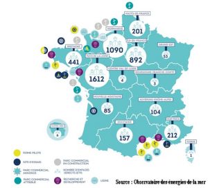Début 2022, la France ne comptait aucun parc éolien en mer en fonctionnement mais 4 projets éoliens en mer posés sont en cours de construction et 3 autres sont en phase de développement. D’ici 2028, ce sont donc 7 projets d’éolien en mer posé, pour une puissance cumulée d’environ 3,6 GW qui seront mis en service. Sont également en cours de développement 4 fermes pilotes d’éolien flottant représentant une capacité installée d’environ 120 MW ainsi que 4 fermes pilotes pour l’hydrolien (2 dans le Raz-Blanchard, Ouessant, Golfe du Morbihan). L’actuelle Programmation Pluriannuelle de l’Energie (PPE) prévoit une capacité installée avoisinant les 5 à 6 GW en service à horizon 2028 pour l’éolien en mer.