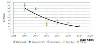 Au cours des dernières années, le coût de l’éolien en mer posé a fortement diminué, capitalisant sur le retour d’expérience de la phase d’apprentissage initiale et profitant des effets positifs d’un déploiement industriel mondial. En 2019, le dernier appel d’offres pour un projet éolien en mer au large de la France (le projet éolien en mer de Dunkerque) fut attribué à un prix de 44 €/ MWh (hors raccordement). Cette tendance de baisse des coûts devrait se poursuivre dans les prochaines années (pour l’éolien en mer posé comme pour le flottant), grâce notamment aux innovations technologiques et au changement d’échelle dans les volumes de projets attribués.