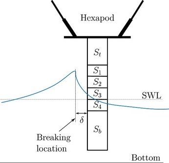 Dans le cadre du projet DIMPACT (thèse de Florian Hulin1, soutenue en Avril 2024), des travaux de recherche portent sur l’étude des chargements hydrodynamiques induits par l’impact de vagues déferlantes sur les éoliennes en mer. DIMPACT a bénéficié du financement de France Energies Marines, de ses membres et partenaires, ainsi que d’une aide de l’Etat gérée par l’Agence Nationale de la Recherche au titre du plan d’investissement France 2030 (convention ANR-10-IEED-06-34). Une importante campagne d’essai, réalisée dans le bassin à houle de l’IFREMER, comprenant la conception et l’utilisation d’une maquette segmentée qui permet de mesurer séparément les efforts agissant sur les différentes sections, en contrôlant finement la position et l’inclinaison de la maquette. Le dispositif permet également de prescrire un mouvement à la maquette, afin de simuler les mouvements induits par la houle pour une éolienne flottante. Notons également qu’une méthode d’analyse originale, permettant de compenser les perturbations causées par les vibrations de la maquette (qui sont générées par l’impact de la vague) sur les mesures d’effort, a été mise au point2. Cette méthode repose sur l’utilisation des mesures d’accélérations en différents points de la maquette et permet de grandement améliorer la précision des mesures. Cette étude a permis de caractériser finement l’influence de la distance de déferlement δ (distance entre l’endroit où la vague commence à se retourner et la position de la structure), de l’intensité du déferlement (caractérisée par le paramètre Γ introduit par Derakhti et al. (2020)), de l’inclinaison du cylindre et d’une vitesse d’avance sur les chargements hydrodynamiques, et de proposer une formulation empirique pour décrire ces efforts.